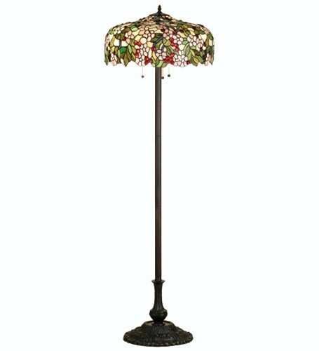 #66466 Features: -Floor lamp.-Cardinal red jewel cherries glisten between rosy pink flowers and verdant green leaves in version of the tiffany studio's cherry blossom. Color/Finish: -Cascading blooms and fruit form the undulating edge of this colorful and intricately patterned stained glass shade.-Lovely shade rests on a mahogany bronze hand finished floor lamp base. Specifications: -Accommodates: (3) 60W medium bulb. Dimensions: -Overall dimensions: 63'' H x 20'' W.