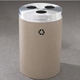 | ✚✚✚ Glaro RecyclePro III Receptacle, 33 Gallon, 20 inch W, 3 ea. 4-7/8 inch Dia. holes, No Message, Only Recycling Logo, Desert Stone Finish, Satin Brass Top, Shown with Satin Aluminum Top Glaro RecyclePro III Receptacles are designed to collect three types of recyclables in a single container. Featuring three 4-7/8 inch dia. holes, each with 33.3% capacity, these receptacles are ideal for indoor and outdoor use. The cans are available in 2 all metal finishes; All Satin Aluminum and All Satin Brass; or 5 designer powder coat finishes; Satin Black, Burgundy, Desert Stone, Hunter Green and Espresso Brown - with your choice of a Satin Aluminum, Satin Brass or Matching Powder Coat finish cover.