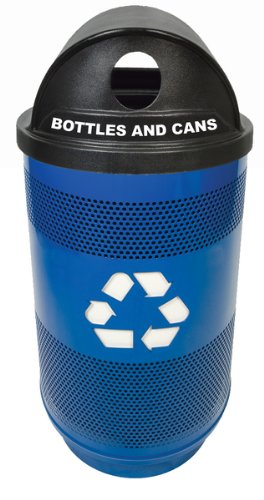 Perforated Receptacle-Stadium Series Perforated Receptacle-Stadium Series?Stadium Series perforated steel recycling receptacle with hood top. Comes with your choice of 2 separate liners or 1 liner. Recycle symbol laser cut into front of unit. Comes standard with leveling feet and lid attachment kit. Diameter:23.5 Height: 49 Weight: 91Capacity in Gallons: 55 Material: Steel Color: Blue Streak II in/out: Outdoor Sold Individually (IMPORTANT) SHIP TIME: 2 weeks .Please note: If there is a color/size/type option, the option closest to the image will be shipped (Or you may receive a random color/size/type)..